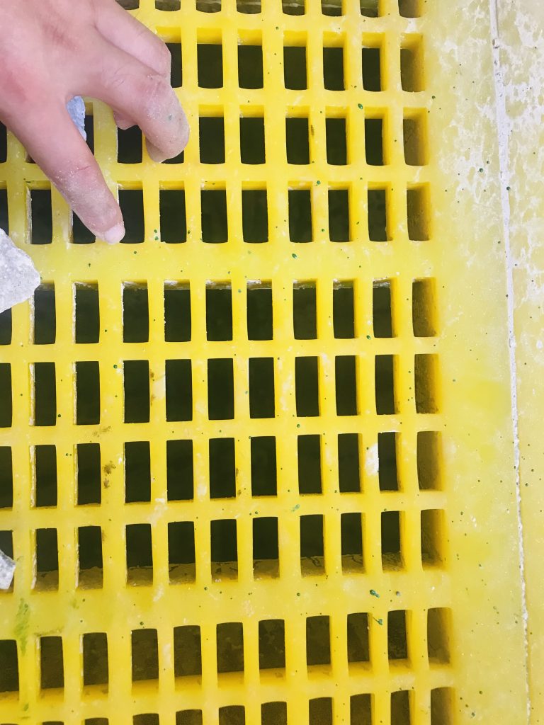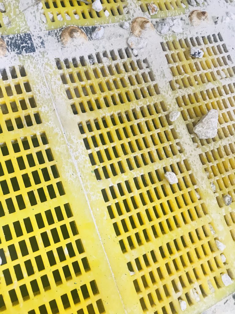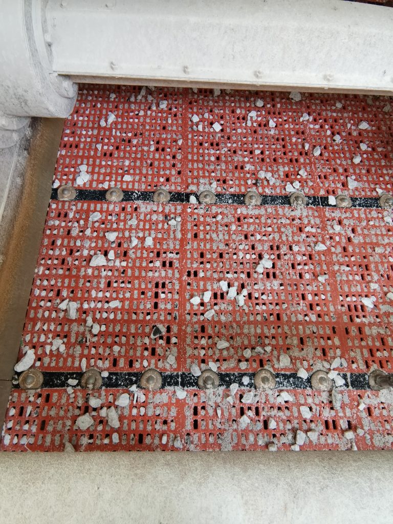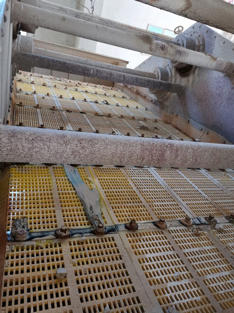 ? ? 無奈之下,宜春鉭鈮礦的工作人員準(zhǔn)備使用某國外著名品牌的橡膠篩網(wǎng),但更換成本高、改造時間長等因素讓他們一直猶豫。在猶豫之時,南昌鑫力的技術(shù)人員為他們帶來了滿意的解決方案,即不改變原篩網(wǎng)結(jié)構(gòu)型式,將原來14x30mm的孔改為12x30mm,將普通聚氨酯篩網(wǎng)更換為南昌鑫力生產(chǎn)的MDI雙硬度防堵篩網(wǎng)。該方案得到了江鎢集團(tuán)領(lǐng)導(dǎo)和宜春鉭鈮礦領(lǐng)導(dǎo)的認(rèn)可,雙方于2020年3月簽訂了合同,4月26日篩網(wǎng)安裝完成并投入使用。