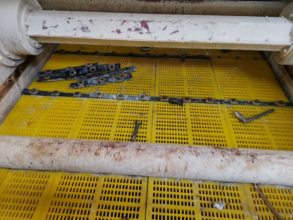 ? ? 2019年12月,南昌鑫力技術(shù)人員走訪宜春鉭鈮礦時,了解到現(xiàn)場使用的一臺2460直線篩具有篩網(wǎng)堵孔、使用壽命低等影響篩分效率的問題,這個問題困擾了宜春鉭鈮礦的工作人員近十年,為解決篩網(wǎng)問題,他們先后使用過金屬沖孔篩網(wǎng)、不銹鋼條縫篩網(wǎng)、TDI聚氨酯篩網(wǎng),但都是“治標(biāo)不治本”。