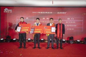 總結(jié)表彰大會(huì)上,南昌礦機(jī)為2021年度經(jīng)營(yíng)發(fā)展做出突出貢獻(xiàn)的集體和個(gè)人進(jìn)行了表彰,先后頒發(fā)了《2021年度優(yōu)秀評(píng)選獎(jiǎng)》科技南礦類、品質(zhì)南礦類、服務(wù)南礦類、國際南礦類、效益南礦類的優(yōu)秀團(tuán)隊(duì)及個(gè)人獎(jiǎng),“2021年度特別貢獻(xiàn)獎(jiǎng)”,“南昌礦機(jī)2021年度金秋運(yùn)動(dòng)會(huì)”團(tuán)隊(duì)及個(gè)人獎(jiǎng),進(jìn)行了2021年度快樂會(huì)議積分優(yōu)秀獎(jiǎng)表彰和抽獎(jiǎng),開展了幸運(yùn)大抽獎(jiǎng)及發(fā)紅包等活動(dòng),現(xiàn)場(chǎng)氣氛高漲不已。
